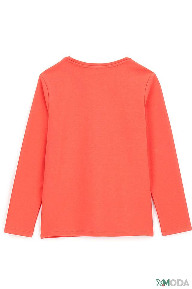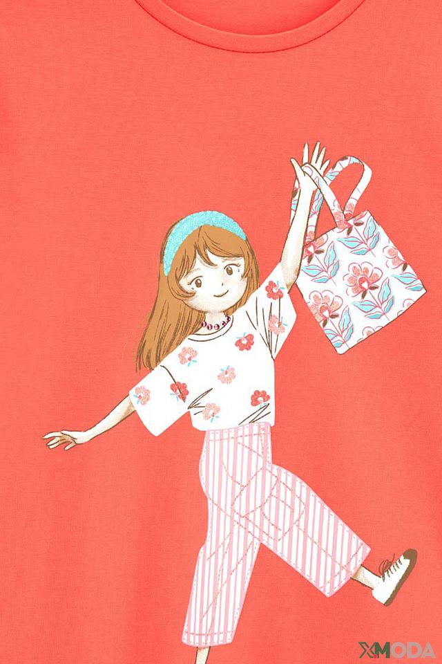 Основной цвет футболки – коралловый, который отлично подходит для летнего сезона. На передней части футболки расположен красочный принт с изображением девочки с сумкой, что придает ей игривый и привлекательный вид.