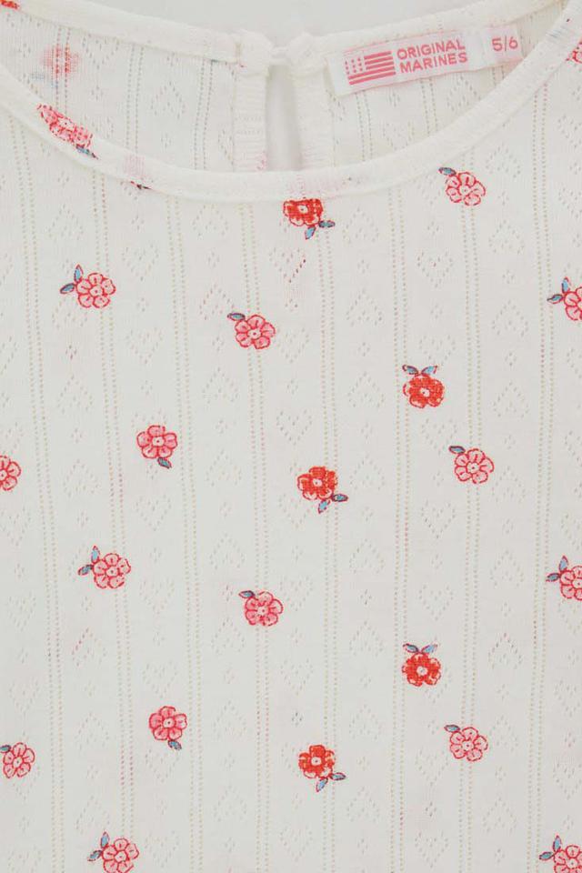 Эта очаровательная футболка от Original Marines станет прекрасным дополнением к гардеробу юной модницы. Футболка выполнена в нежном молочном цвете и украшена милым цветочным принтом, который придает ей романтичный вид.