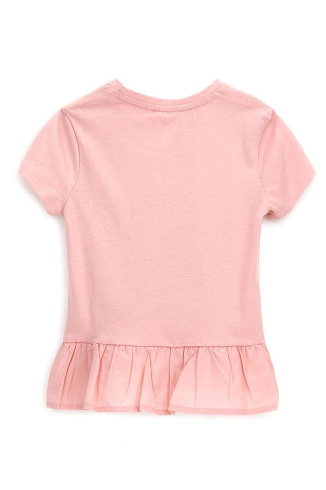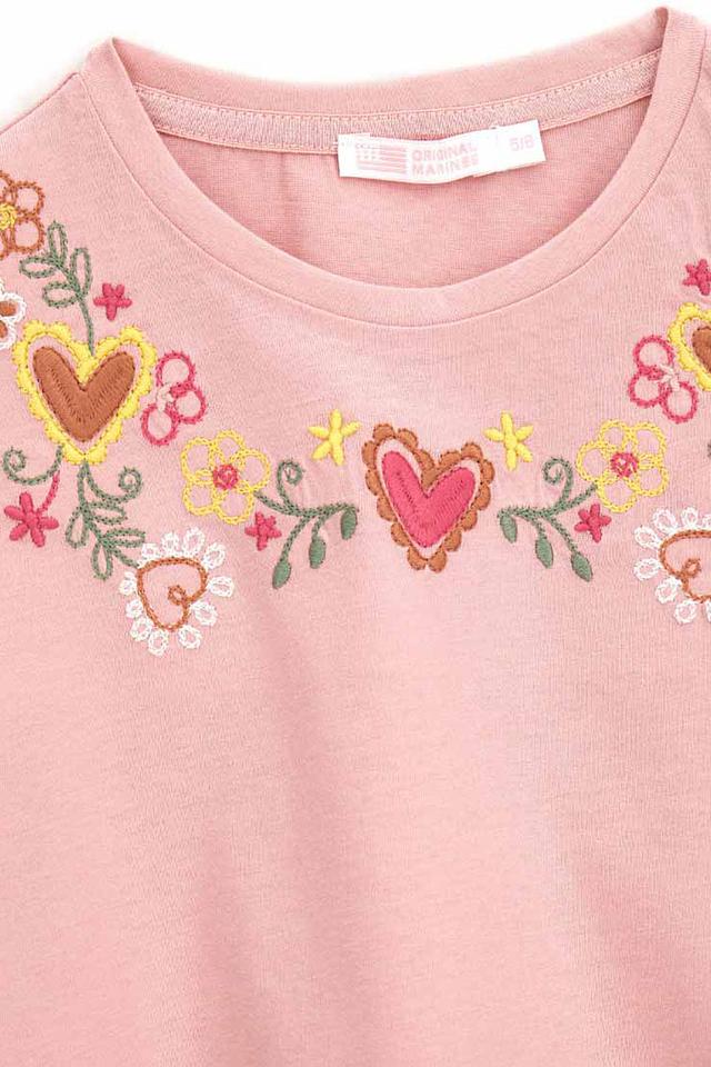 Розовая футболка Original Marines для девочки с нежной цветочной вышивкой. Модель выполнена из 100% хлопка, имеет короткий рукав и оборку по низу, что придает ей особый шарм. Состав: хлопок 100%, Состав_2 хлопок 100%