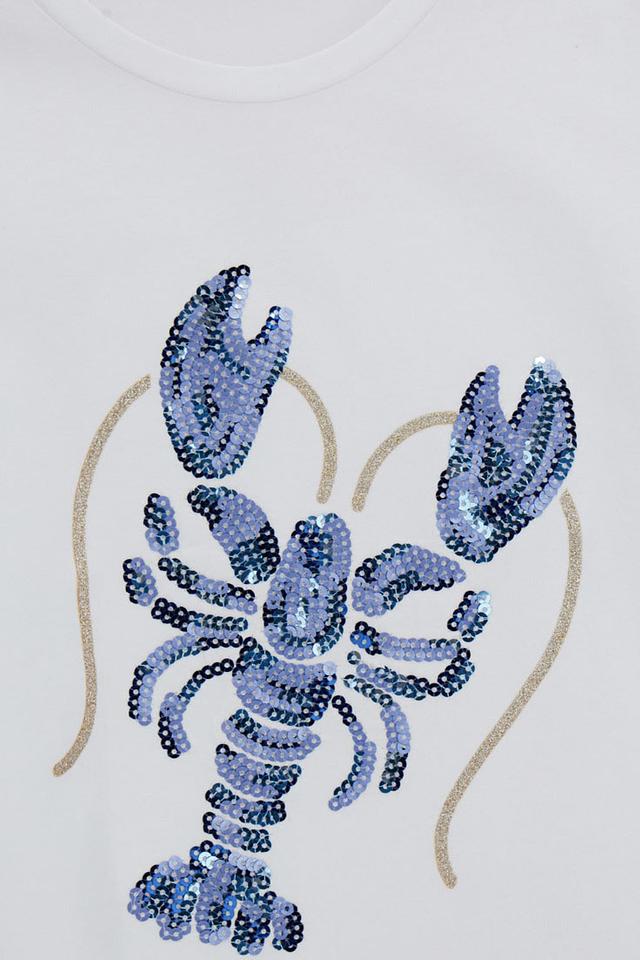 Особенность этой футболки – яркая аппликация в виде краба, выполненная с использованием синих и золотистых элементов. Такой дизайн обязательно понравится девочкам, любящим морскую тематику.