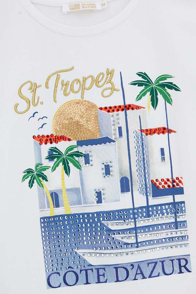 Белая футболка Original Marines для девочки с ярким принтом в стиле "St. Tropez". Изготовлена из мягкого хлопка с добавлением эластана для комфорта и свободы движений. Состав: хлопок 92%, эластан 8%