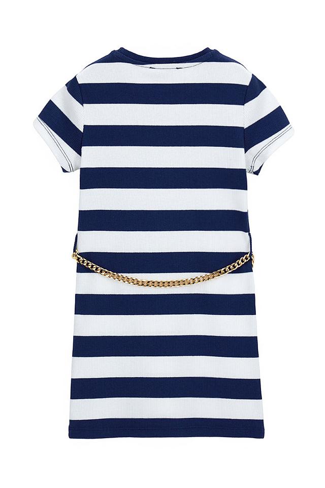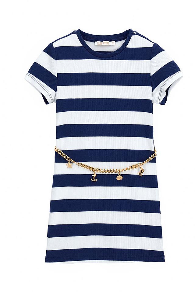 Синее платье Original Marines в классическую полоску – удобный и стильный выбор для девочки. Модель с короткими рукавами и декоративной цепочкой добавит образу изысканности и очарования. Состав: хлопок 95%, эластан 5%