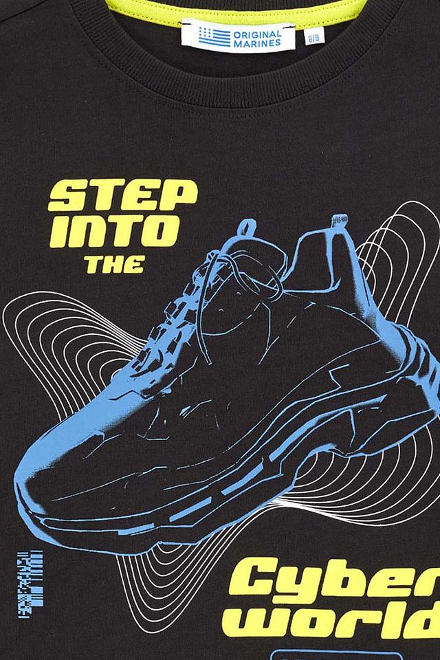 Эта футболка от Original Marines станет отличным дополнением к гардеробу вашего мальчика. Футболка выполнена в классическом чёрном цвете и украшена эффектным принтом в стиле киберпанк с изображением кроссовок и надписями "Step into the Cyber World".