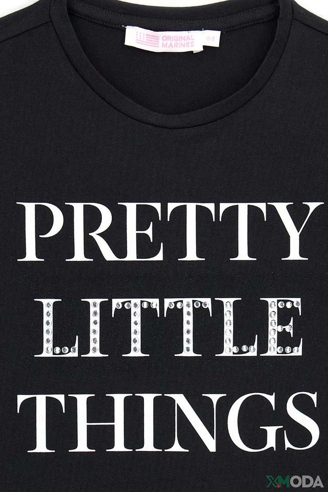 Чёрная футболка Original Marines для девочки с надписью "PRETTY LITTLE THINGS". Изготовлена из мягкого хлопка с добавлением эластана для комфорта и свободы движений. Стильный и удобный вариант для повседневной носки. Состав: хлопок 95%, эластан 5%