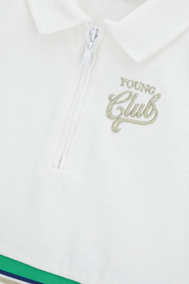 Особенностью данной модели является воротник-поло с короткой молнией и декоративные полоски в нижней части изделия: синяя, белая, золотистая и зеленая. На груди расположена стильная надпись "Young Club", выполненная золотистым цветом.