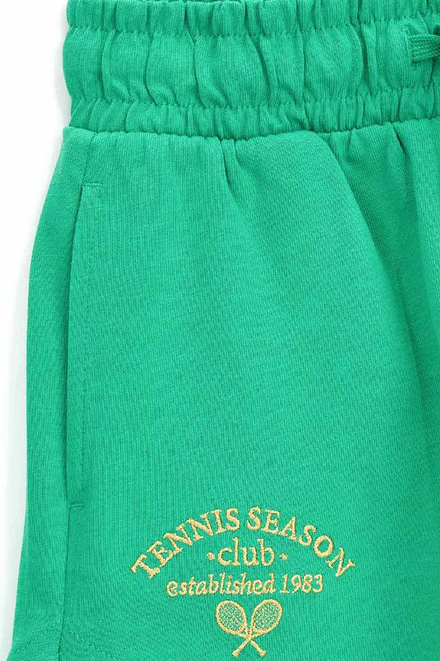 Шорты имеют яркий зелёный цвет и украшены стильным принтом "Tennis Season Club", который добавляет им индивидуальности. Эластичный пояс с кулиской обеспечивает удобную посадку, а свободный крой не сковывает движений.