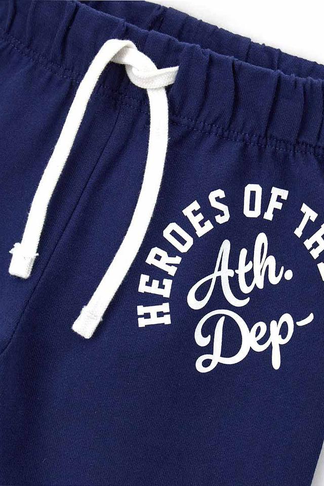Брюки имеют классический синий цвет и украшены ярким белым принтом с надписью "HEROES OF THE Ath. Dep.". Эластичный пояс с регулируемым шнурком обеспечивает надежную посадку, а манжеты на штанинах предотвращают попадание холода.