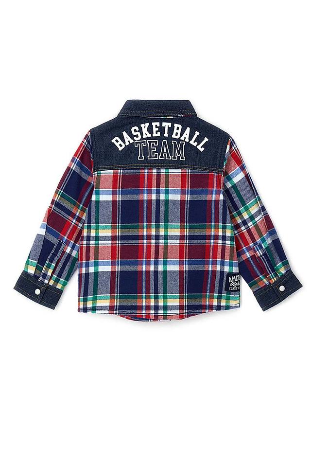 Рубашка имеет классический крой с длинными рукавами и удобной застёжкой на пуговицы. На груди расположена декоративная нашивка с буквой "M", а на спине – аппликация "Basketball Team".