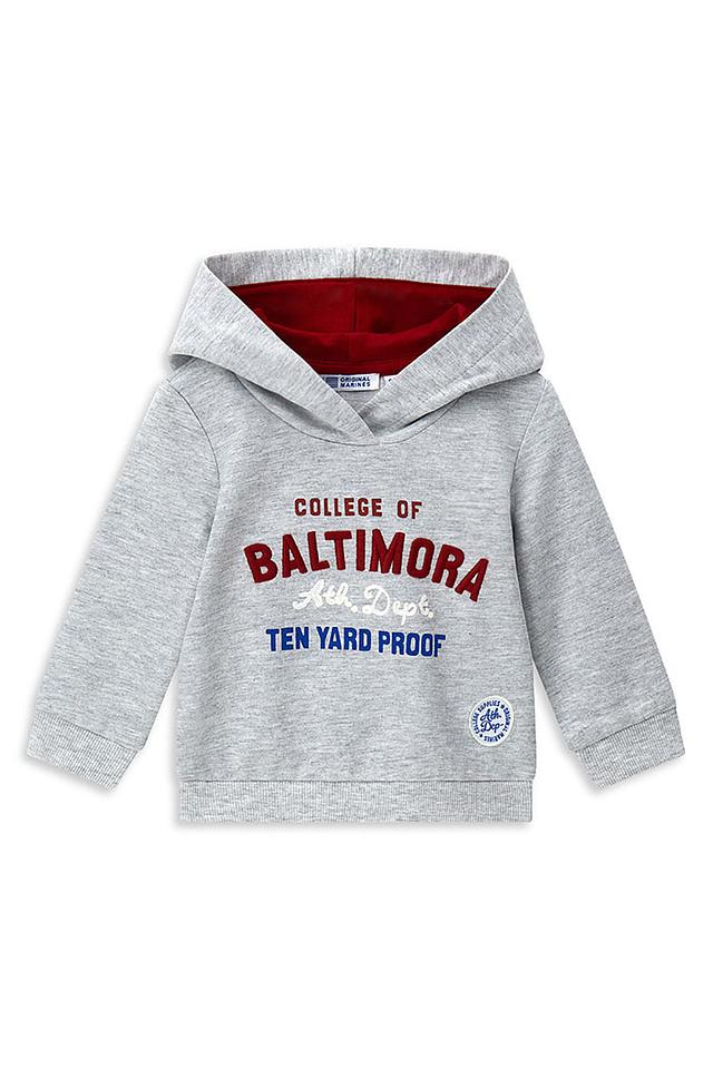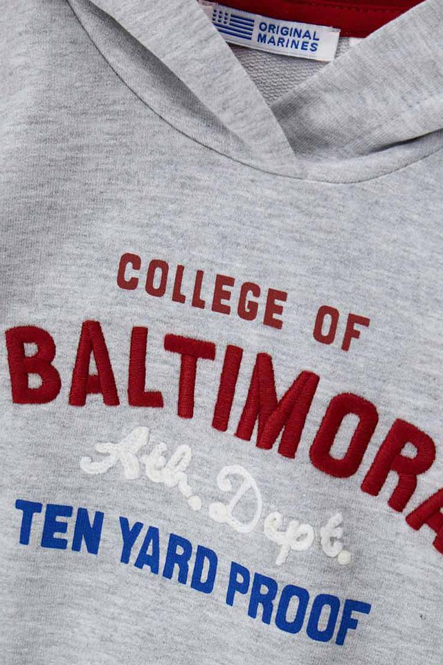 Серая толстовка Original Marines для мальчика с ярким принтом "College of Baltimore". Удобная модель с капюшоном и мягкой хлопковой основой идеально подойдёт для повседневной носки. Состав: Состав_подкладка хлопок 100%, хлопок 97%, вискоза 3%
