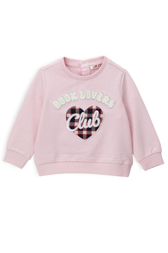 Джемпер имеет классический крой с круглым вырезом горловины и длинными рукавами. Особый акцент сделан на оригинальном принте с надписью "Book Lovers Club" и изображением сердца в клетку, выполненном в контрастных цветах. Декоративная планка с пуговицей придает модели аккуратный и стильный вид.