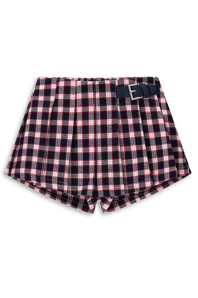 Дизайн юбки выполнен в классическую клетку, сочетающую в себе оттенки синего, красного и белого. Эластичный пояс и аккуратный ремешок с пряжкой придают модели завершенный вид. Юбка-шорты идеально подходит для повседневной носки, прогулок и особых случаев.