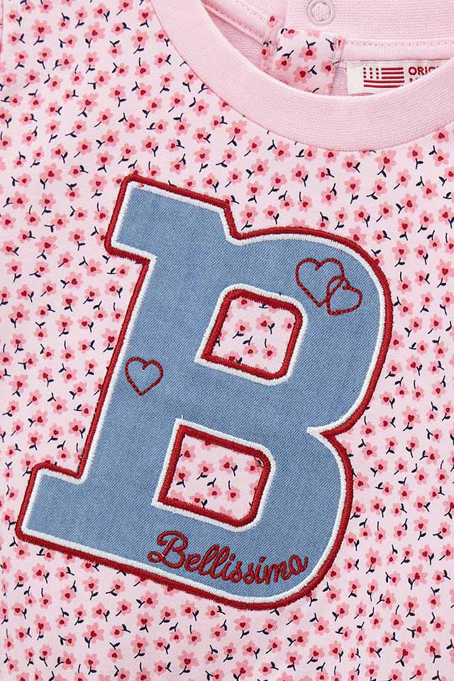 Джемпер украшен ярким цветочным принтом и аппликацией в виде буквы "B" с надписью "Bellissimo". Брюки также выполнены в нежно-розовом цвете и дополнены красными полосками по бокам.