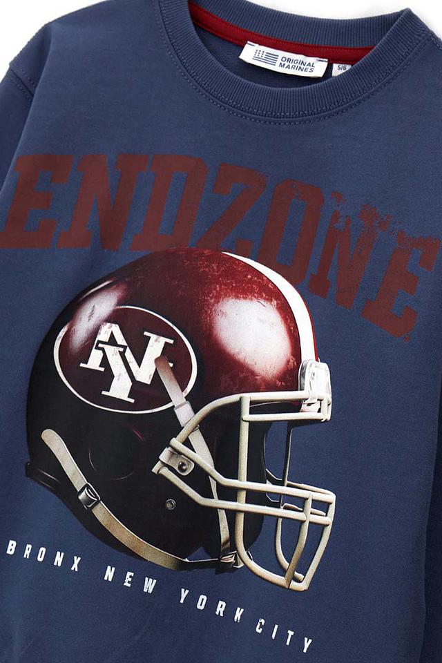 Синий джемпер от Original Marines с ярким принтом в виде американского футбольного шлема станет отличным дополнением к гардеробу юного спортсмена. Изготовлен из мягкого и приятного к телу хлопка. Состав: хлопок 100%