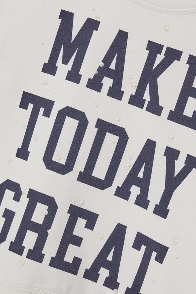 Этот стильный джемпер от Original Marines выполнен в белом цвете и украшен крупной надписью "MAKE TODAY GREAT" тёмно-синим цветом. Модель имеет классический крой с круглым вырезом горловины и длинными рукавами.