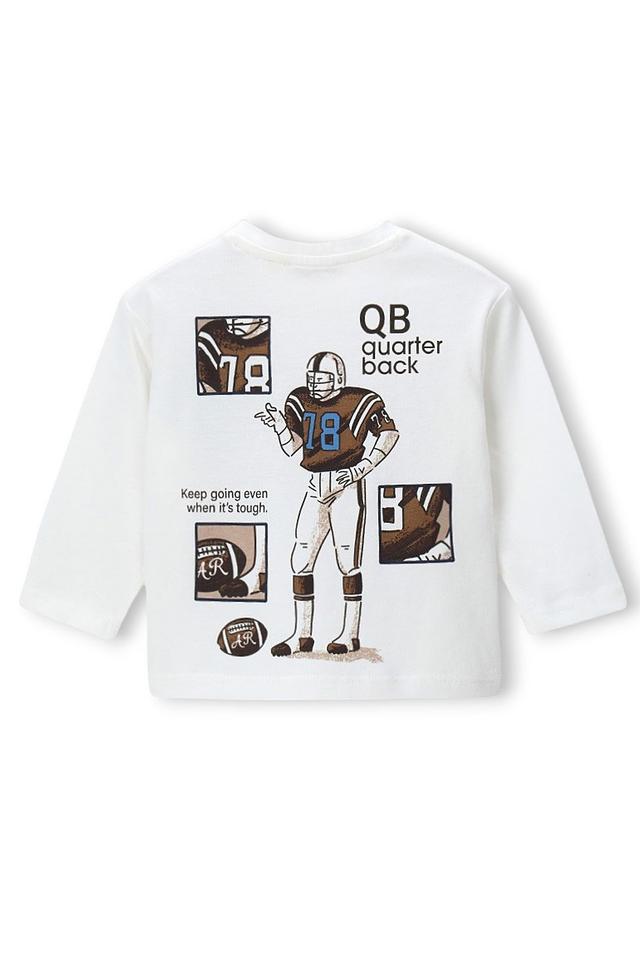 Особенности дизайна: футболка украшена ярким и стильным принтом, изображающим футболиста в игровой форме с надписью "QB quarter back". Принт выполнен в насыщенных цветах и добавляет образу динамичности и спортивного стиля.