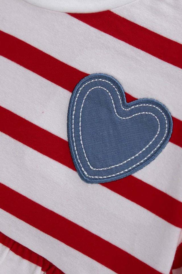 Детская футболка Original Marines красного и белого цвета с ярким принтом в виде сердца. Модель выполнена в полоску с воланами и сборкой по низу, что придает ей нарядный вид. Состав: хлопок 94%, эластан 6%