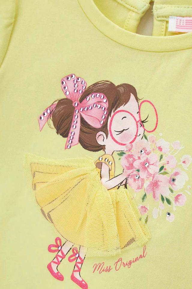 Эта очаровательная футболка от Original Marines станет любимой вещью в гардеробе вашей маленькой модницы. Футболка выполнена в нежном жёлтом цвете и украшена красочным принтом с изображением балерины в розовом платье и пуантах.