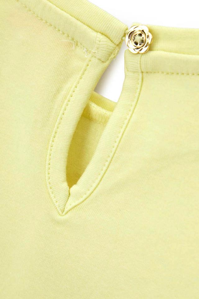 Модель имеет короткие рукава-фонарики, которые придают образу игривость и кокетство. Вырез горловины оформлен аккуратной планкой с декоративной пуговицей в виде цветочка. Футболка выполнена из высококачественного хлопка с добавлением эластана, что обеспечивает мягкость, комфорт и хорошую посадку по фигуре.