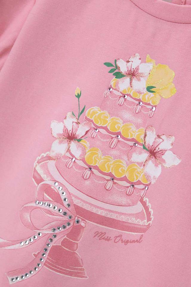 Основным элементом декора является яркий и красочный принт в виде многоярусного торта, украшенного цветами и лентой. Такой рисунок непременно понравится девочкам, любящим сладости и сказочные образы. Футболка имеет круглый вырез горловины, дополненный небольшой декоративной пуговицей в форме цветка.