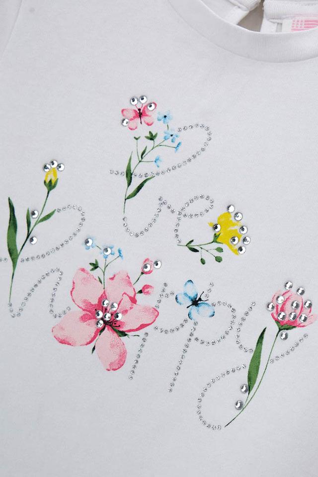 Белая футболка Original Marines для девочки, украшенная нежным цветочным принтом и надписью "Be Happy". Изготовлена из мягкого хлопка с добавлением эластана для комфорта и свободы движений. Состав: хлопок 92%, эластан 8%