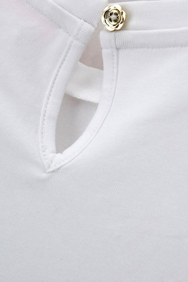 Модель имеет короткие рукава и удобный круглый вырез горловины, который дополнен небольшой декоративной пуговицей в форме цветка. Футболка выполнена из высококачественного хлопка (92%) с добавлением эластана (8%), что обеспечивает мягкость, комфорт и хорошую посадку по фигуре.