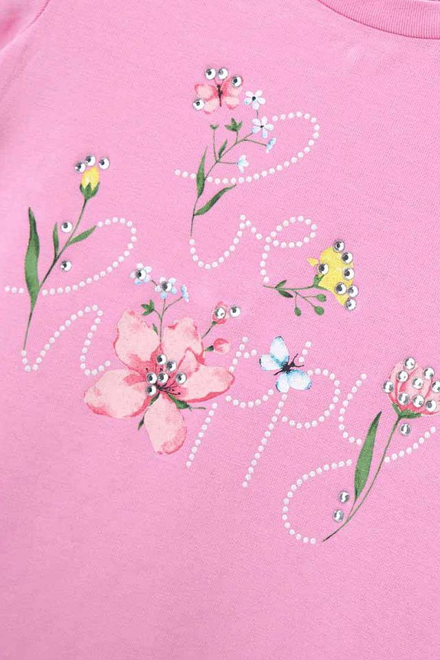 Розовая футболка Original Marines для девочки, украшена цветочным принтом и стразами. Изготовлена из мягкого хлопка с добавлением эластана для комфорта и свободы движений. Состав: хлопок 92%, эластан 8%
