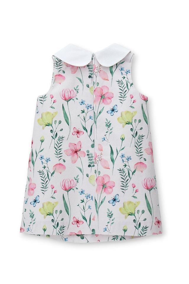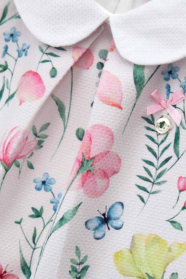 Модель имеет прямой силуэт, короткие рукава и круглый вырез горловины, оформленный воротничком. Платье украшено ярким и красочным цветочным принтом, который добавляет образу игривости и свежести. Застежка на спине выполнена в виде пуговиц.
