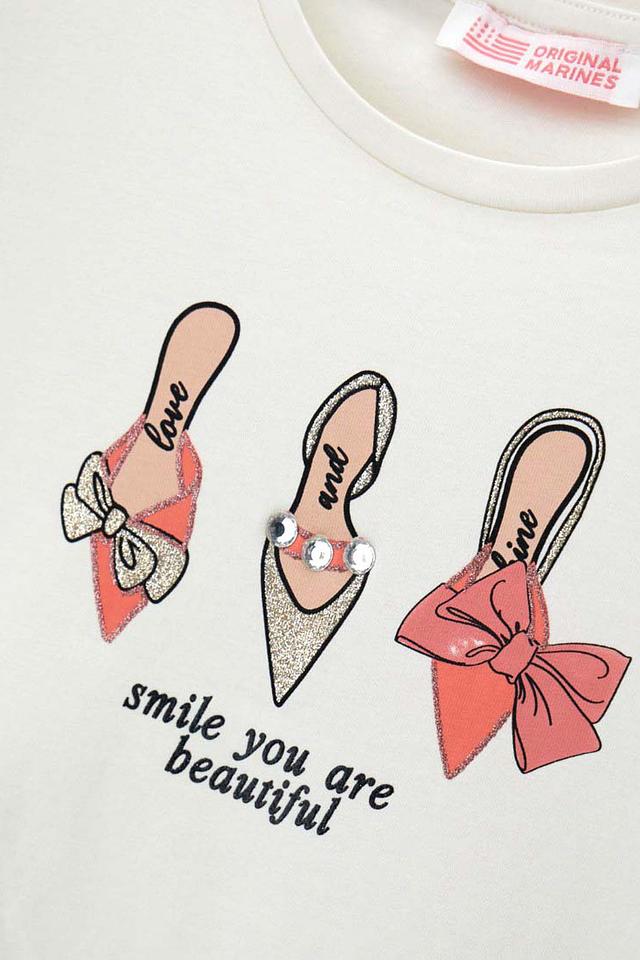Белая футболка Original Marines для девочки с ярким принтом туфель и надписью "smile you are beautiful". Изготовлена из мягкого хлопка с добавлением эластана для комфорта и свободы движений. Состав: хлопок 92%, эластан 8%