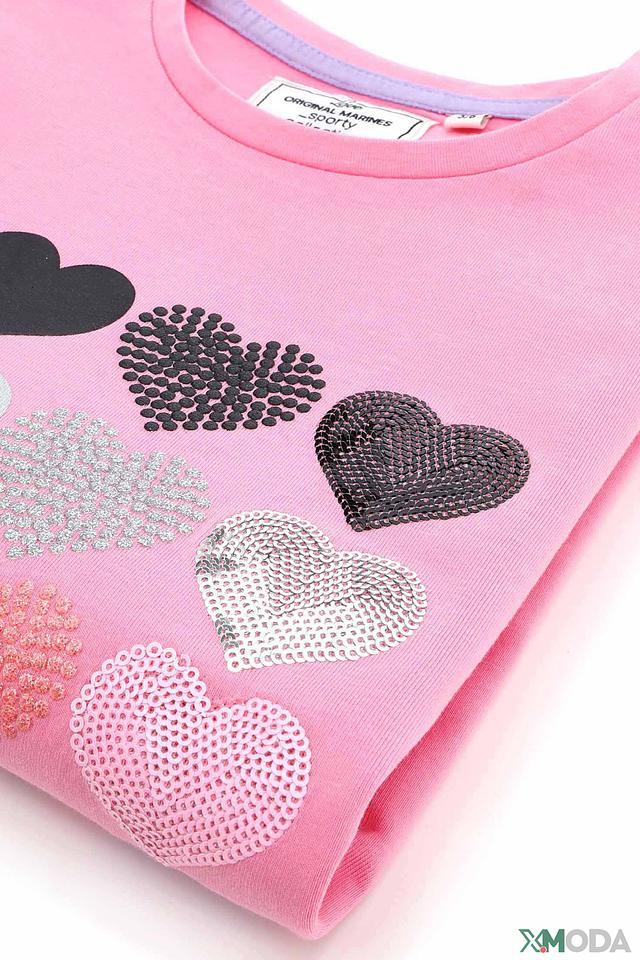 Розовая футболка Original Marines для девочки, украшена аппликацией из пайеток в форме сердечек. Изготовлена из мягкого хлопка с добавлением эластана для комфорта и свободы движений. Состав: хлопок 98%, эластан 2%