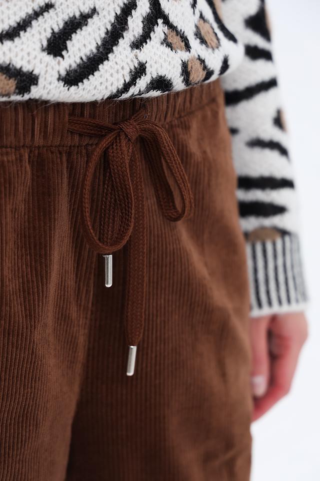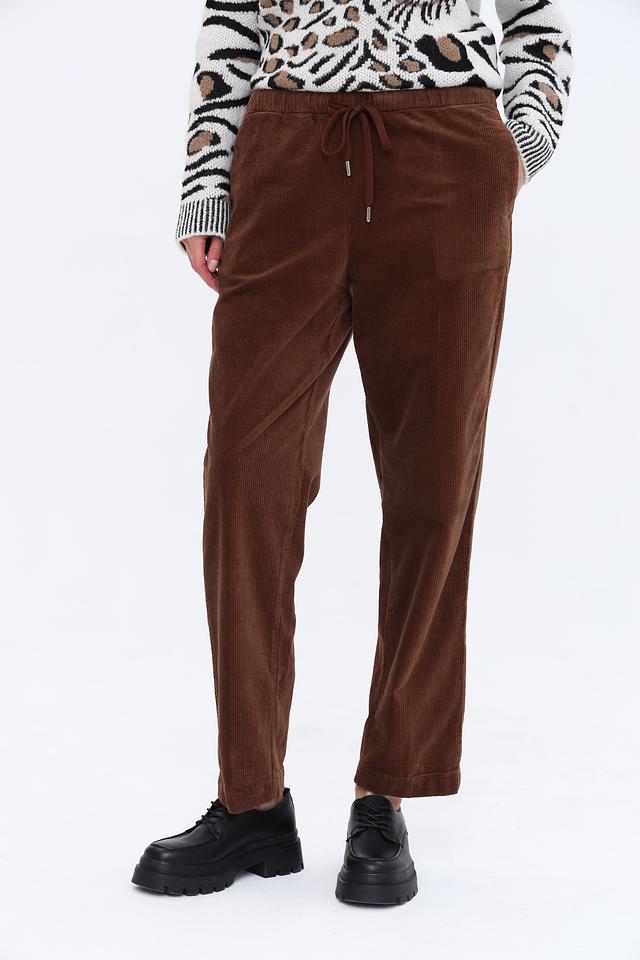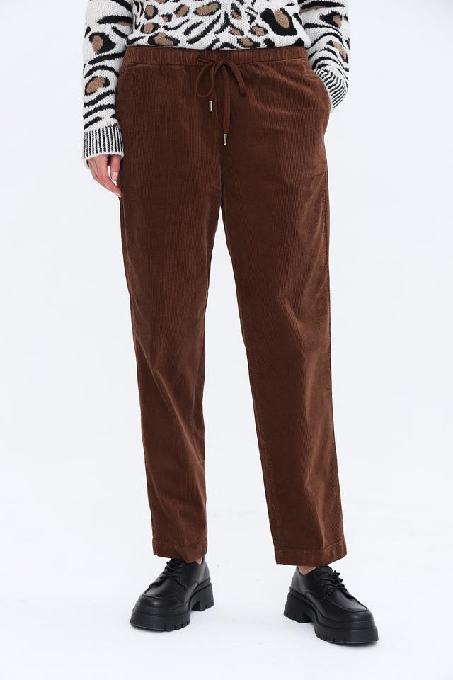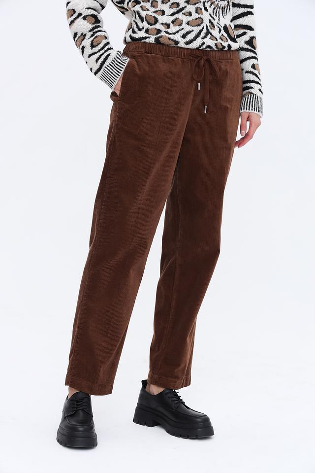 Брюки от Oui классического коричневого цвета выполнены из мягкого вельвета с эластаном в составе. Модель прямого кроя с заниженной талией дополнена удобным поясом на кулиске. Состав: хлопок 98%, эластан 2%
