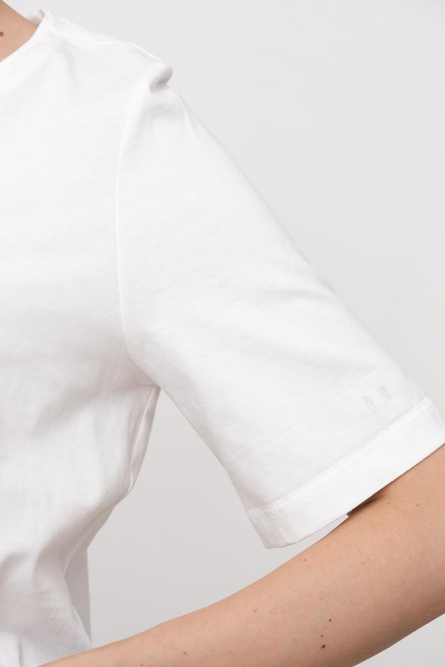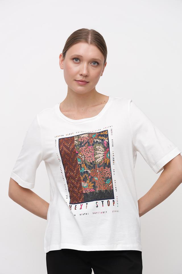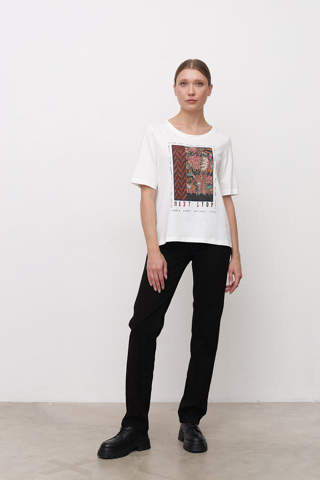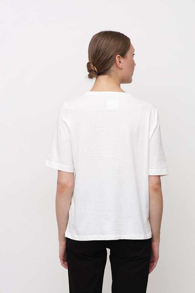Футболка имеет прямой крой и короткие рукава. Она идеально подходит для создания повседневных образов, легко сочетается с джинсами, шортами или юбками. Универсальный белый цвет позволяет комбинировать футболку с различными элементами одежды и аксессуарами.
