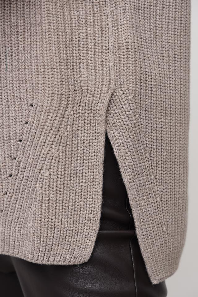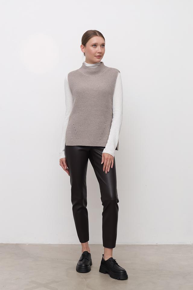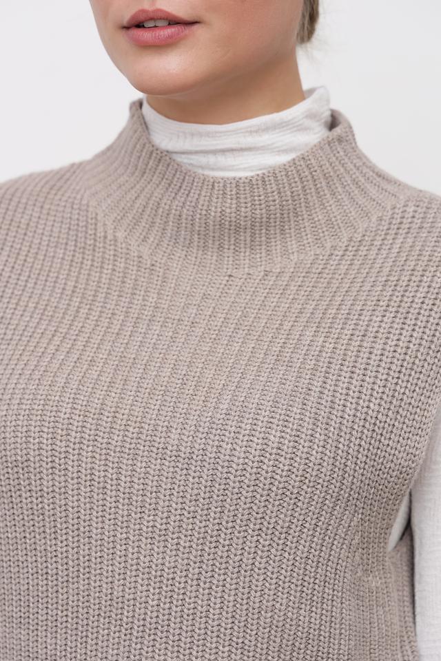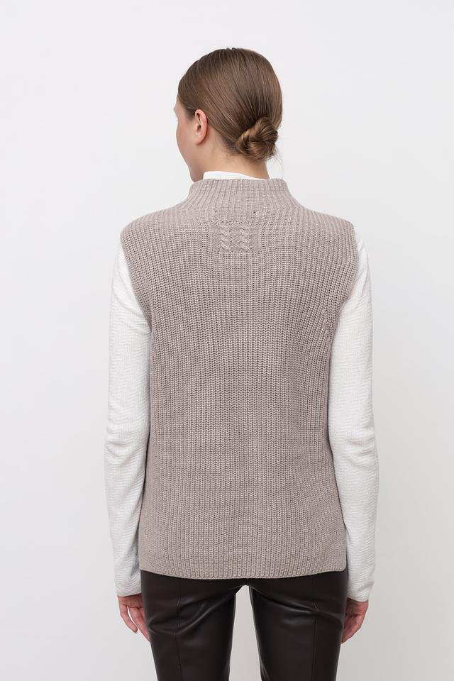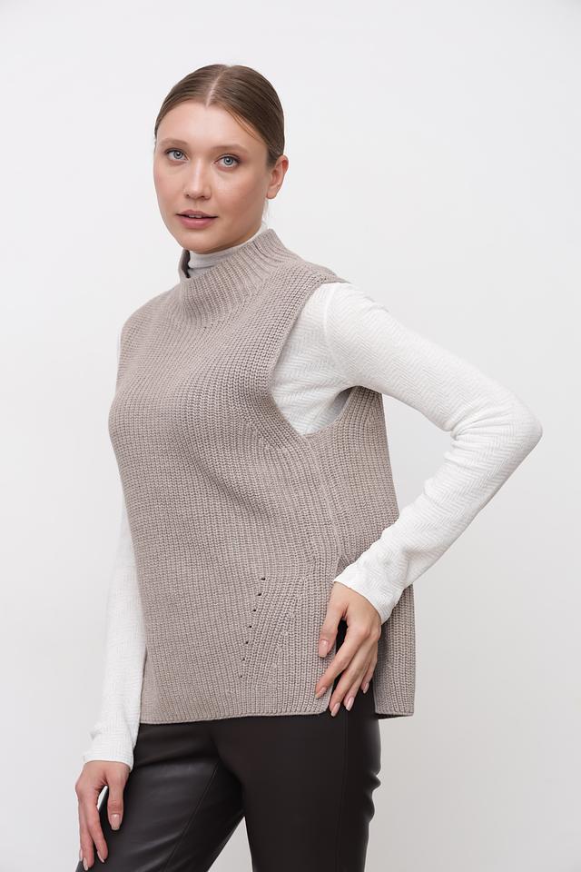 Жилет имеет прямой крой и высокий воротник, что придает ему элегантный вид. Вязаная текстура добавляет изделию мягкости и комфорта. Отсутствие застежек обеспечивает свободу движений и удобство ношения.