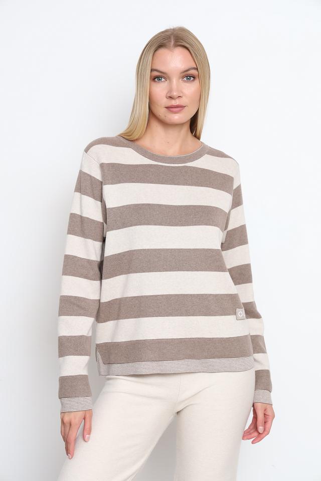 Женский пуловер Oui бежевого цвета с классическим полосатым узором. Изготовлен из мягкого хлопка, обеспечивающего комфорт в носке. Стильный и универсальный выбор для повседневного гардероба. Состав: хлопок 100%