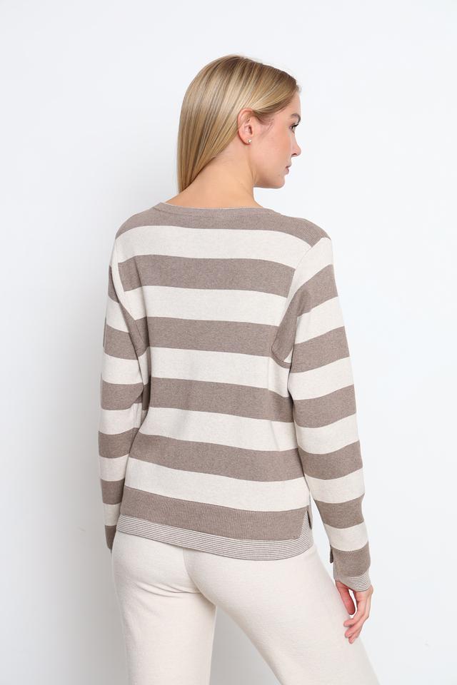 Этот пуловер от Oui – идеальный выбор для создания уютного и стильного образа. Пуловер выполнен в полосатом дизайне, сочетающем в себе оттенки бежевого и светло-коричневого, что придает ему особую привлекательность.