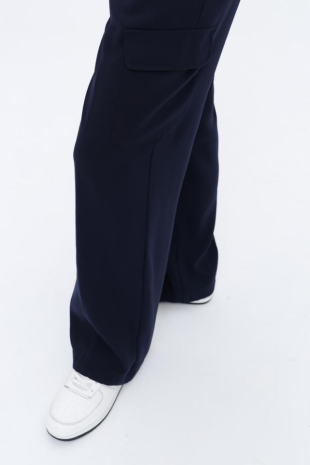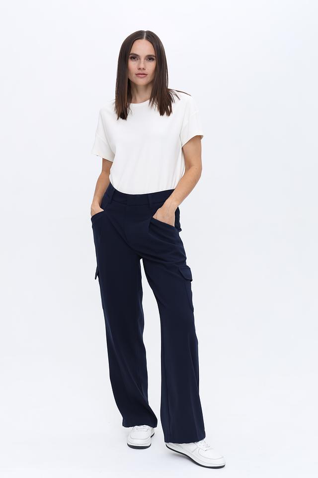 Брюки имеют широкий крой, который обеспечивает свободу движений и комфорт в носке. Высокая посадка визуально удлиняет ноги и подчеркивает талию. Наличие накладных карманов добавляет практичности и оригинальности дизайну.