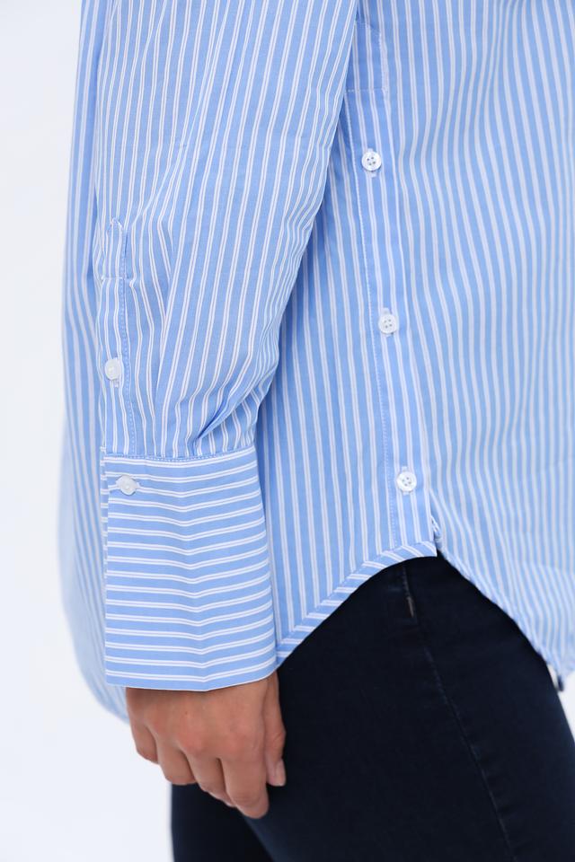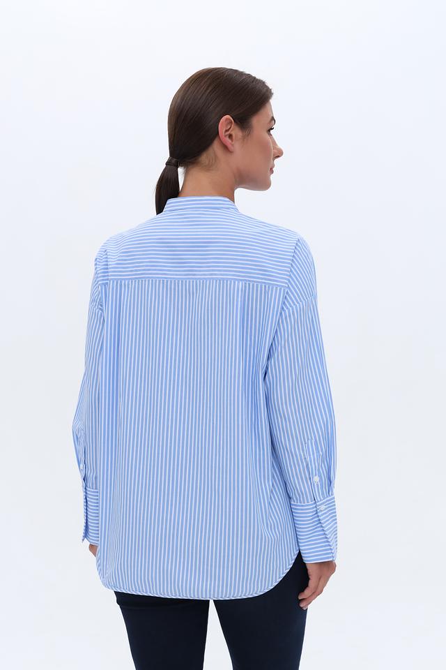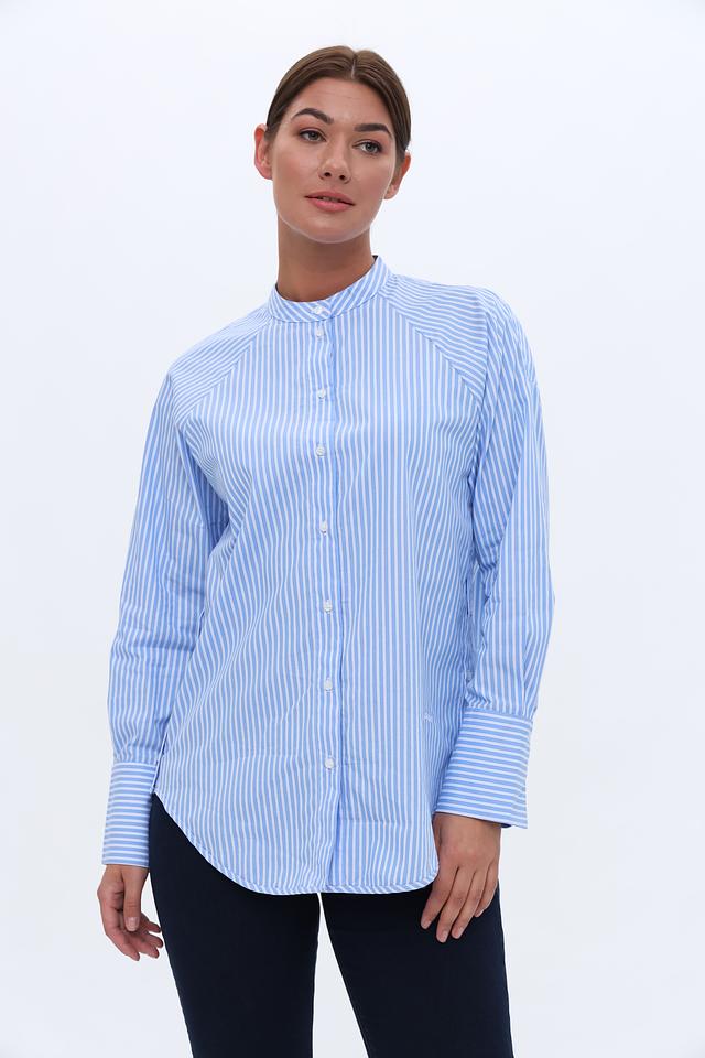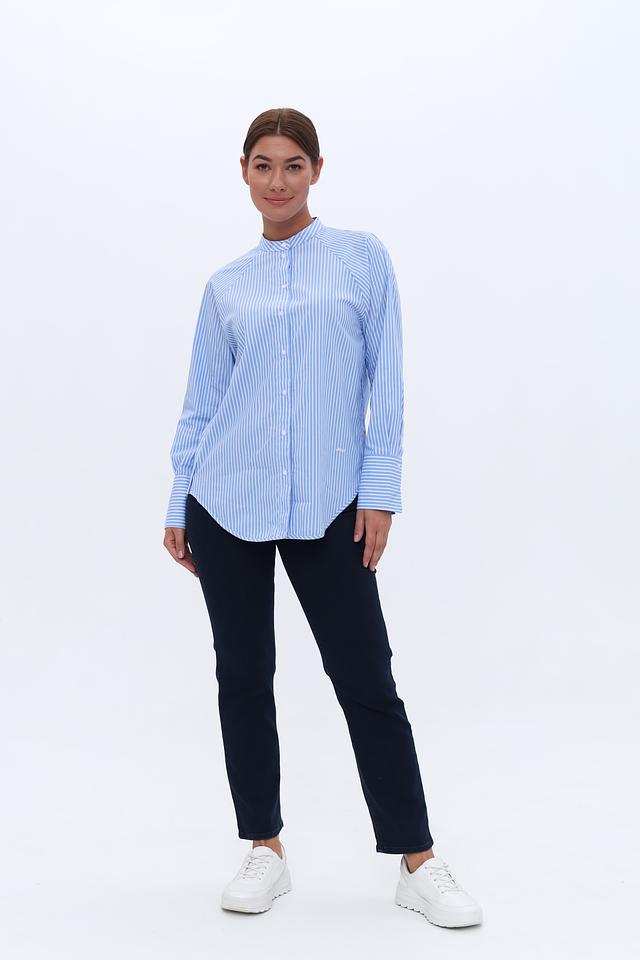 Вертикальная полоска голубого и белого цветов визуально вытягивает силуэт и делает образ более динамичным. Рубашка идеально подходит для создания как повседневных, так и более формальных образов.
