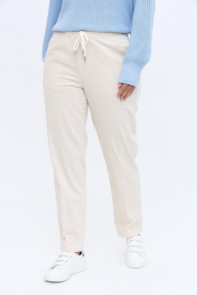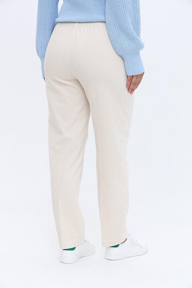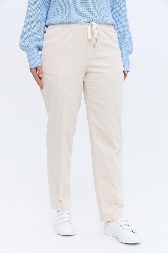 Брюки имеют прямой крой, эластичный пояс со шнурком и манжеты внизу. Текстурированная ткань придает им особый шарм. Бежевый цвет делает их универсальными и легко сочетаемыми с различными элементами гардероба.