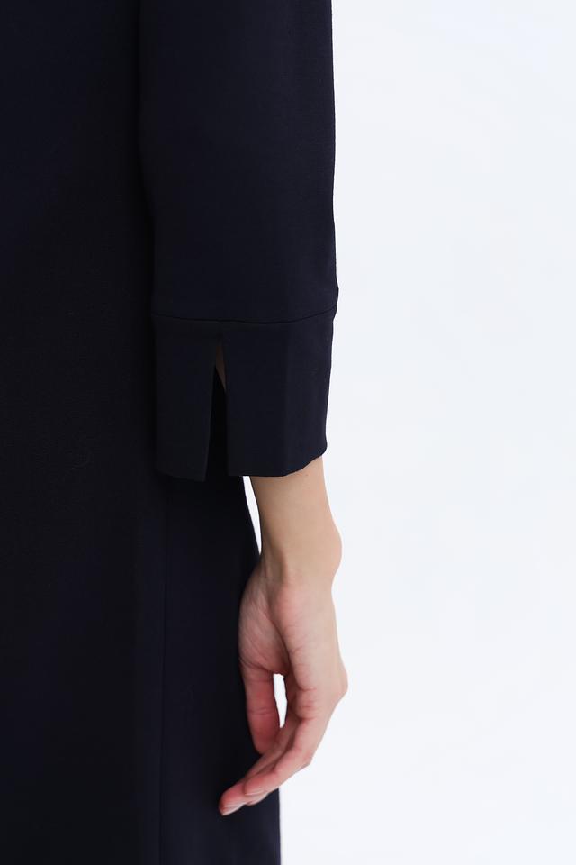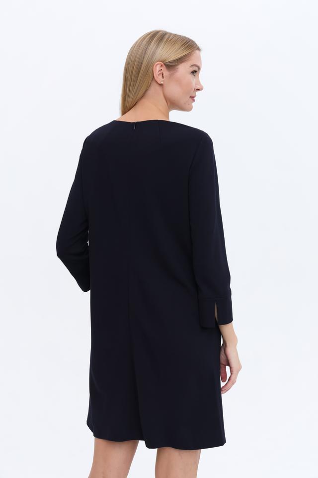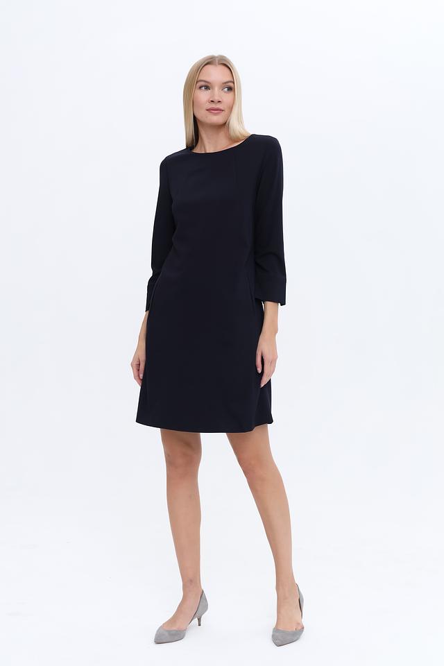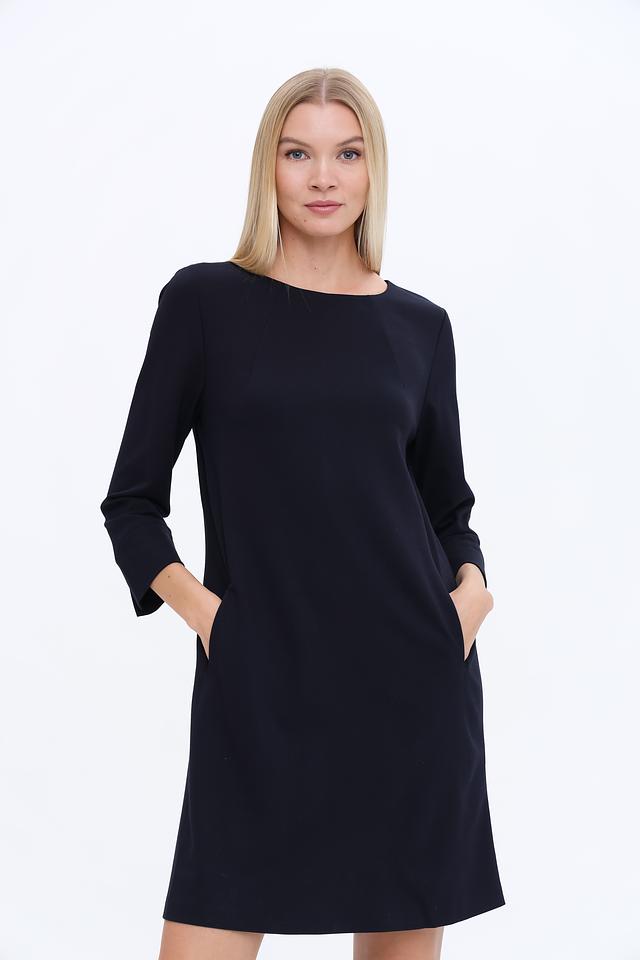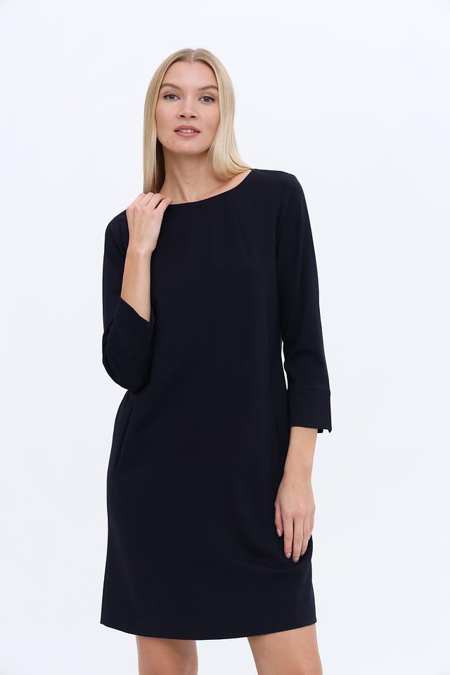 Платье имеет прямой силуэт, который подчеркивает достоинства фигуры, не сковывая движений. Круглый вырез горловины и рукава длиной 3/4 придают образу женственность и элегантность. Наличие боковых карманов добавляет практичности.