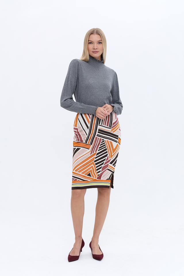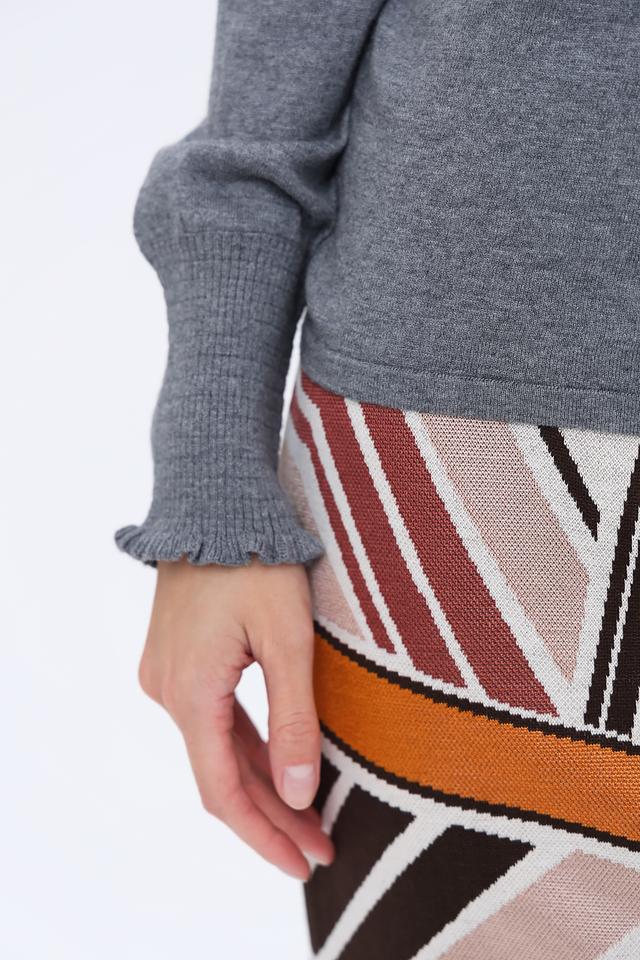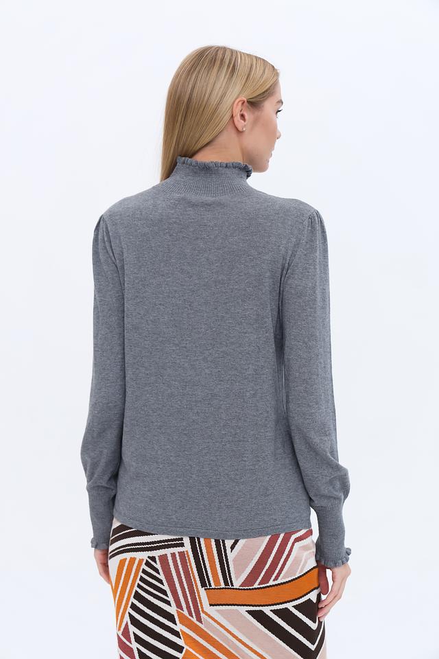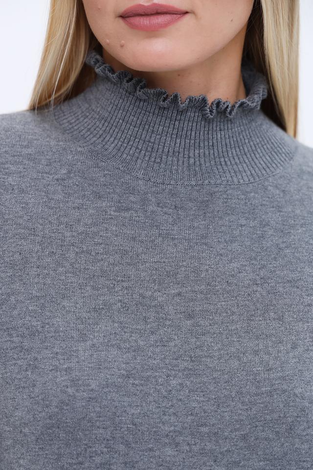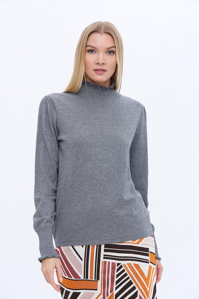 Этот стильный пуловер от бренда Oui выполнен в сером цвете и станет универсальным элементом вашего гардероба. Модель имеет прямой крой и воротник-стойку, украшенный нежной оборкой, что придает ей изысканность.