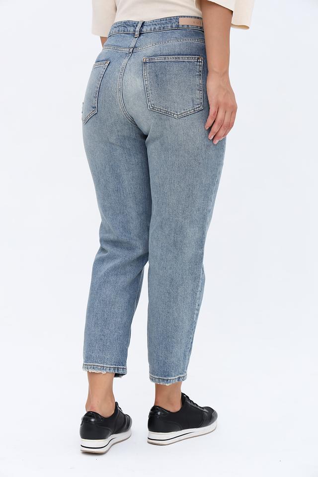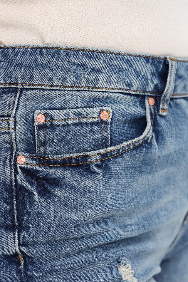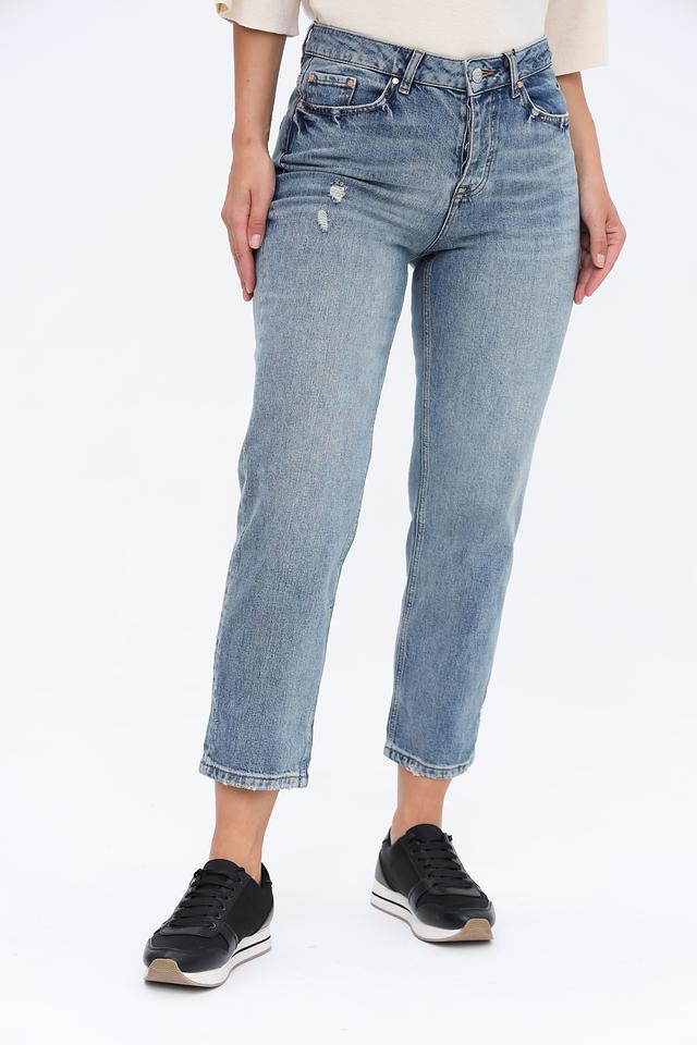 Джинсы имеют прямой крой и завышенную талию, что обеспечивает комфортную посадку и подчеркивает достоинства фигуры. Эффект потертостей и небольшие разрывы придают им непринужденный и современный вид.