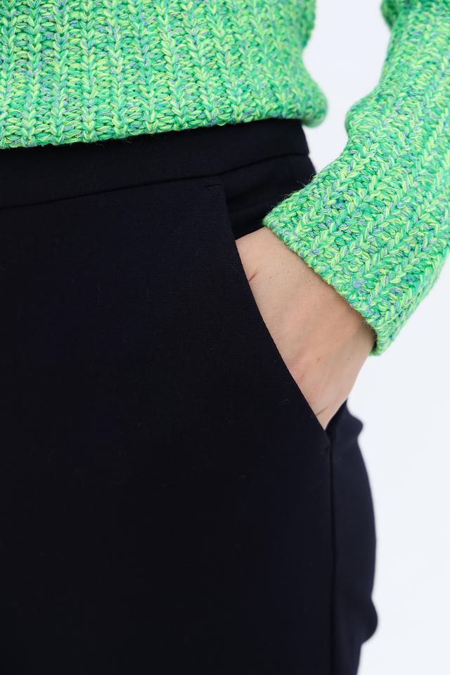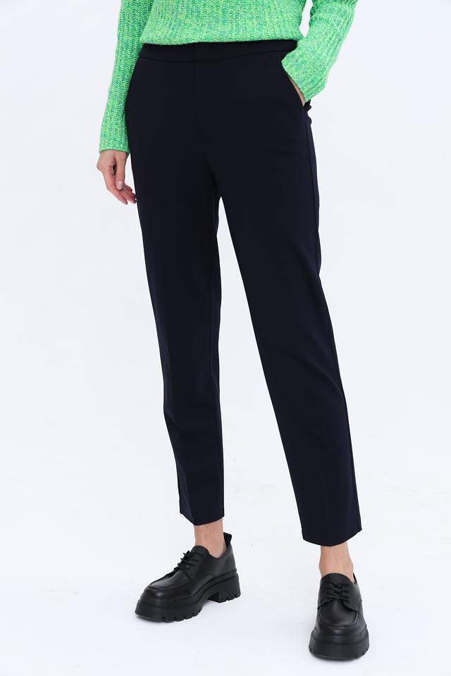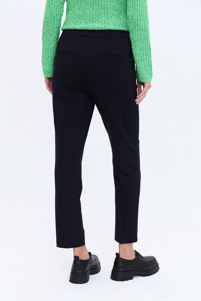 Брюки имеют прямой крой и стандартную посадку по талии. Застёжка на молнию и пуговицу обеспечивает надежную фиксацию. Ткань, состоящая из вискозы, полиамида и эластана, приятна к телу, хорошо держит форму и обеспечивает комфорт при носке.