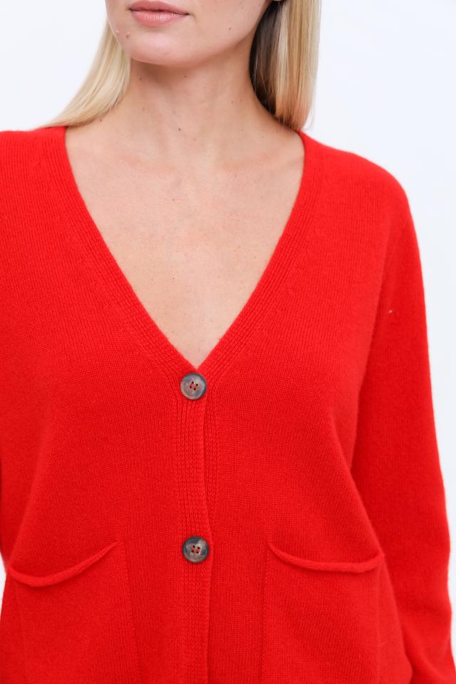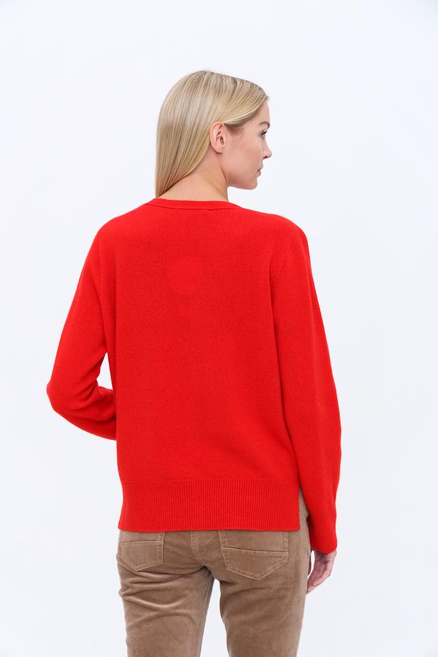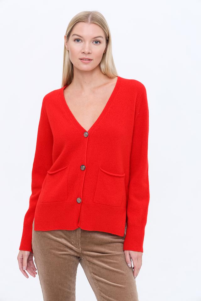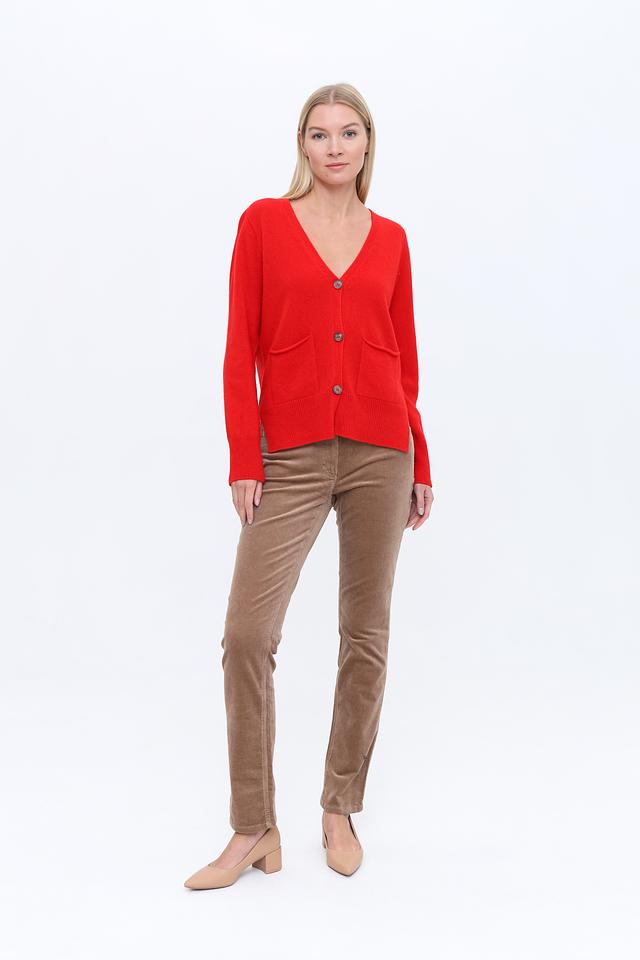 Женский кардиган Oui насыщенного красного цвета с V-образным вырезом и накладными карманами. Изготовлен из мягкой смеси шерсти и кашемира, обеспечивающей комфорт и тепло. Состав: шерсть 85%, кашемир 15%