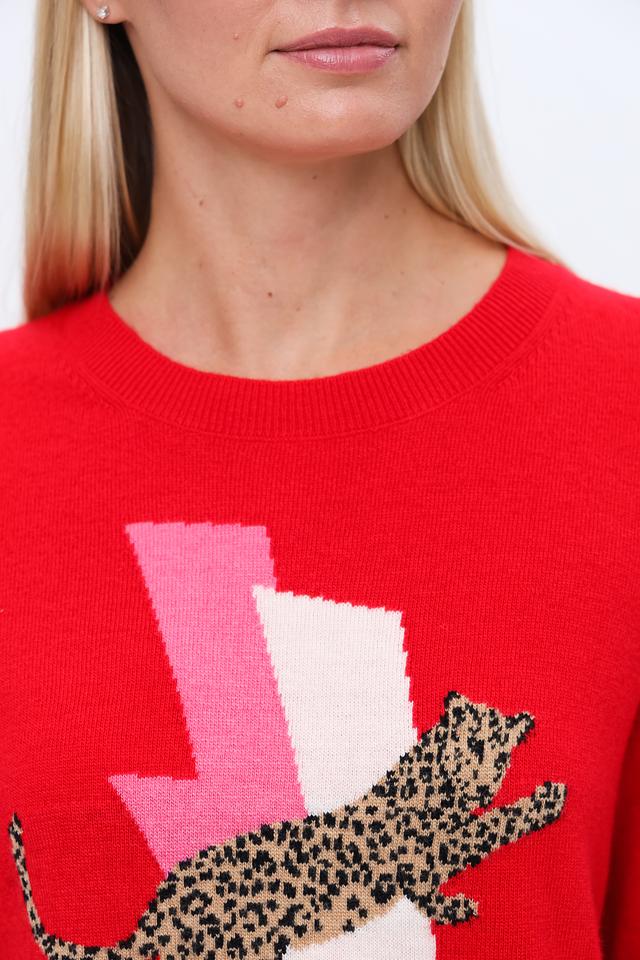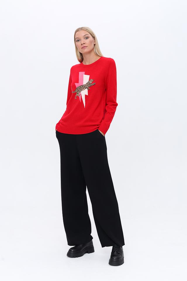 Основным акцентом пуловера является оригинальный принт на лицевой стороне, изображающий молнию и леопарда. Такой дизайн добавит образу динамичности и индивидуальности.