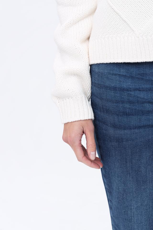 Основной акцент модели – рельефный узор из кос, который придает ей изысканность и оригинальность. Пуловер имеет классический круглый вырез горловины и длинные рукава.