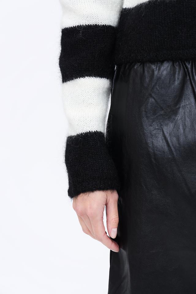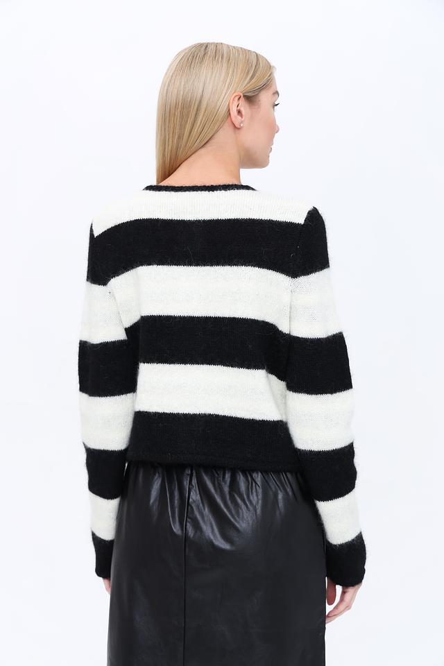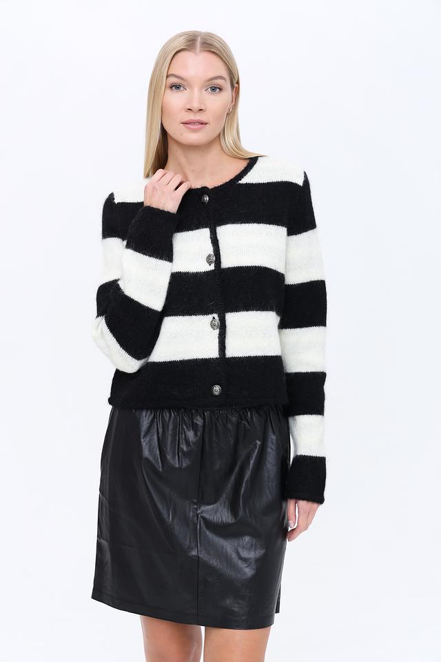 Чёрно-белая полоска придает жакету динамичный и современный вид. Модель выполнена из высококачественного трикотажа, в состав которого входит 40% мохер, 36% полиакрил, 13% хлопок и 11% шерсть. Благодаря этому сочетанию материалов жакет приятен на ощупь, хорошо держит форму и обеспечивает комфорт в носке.