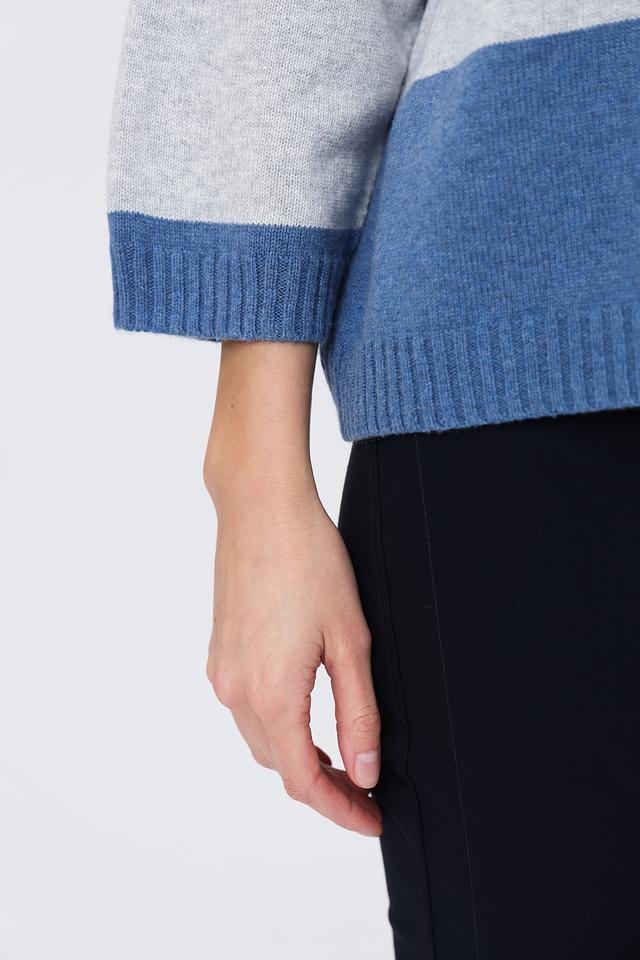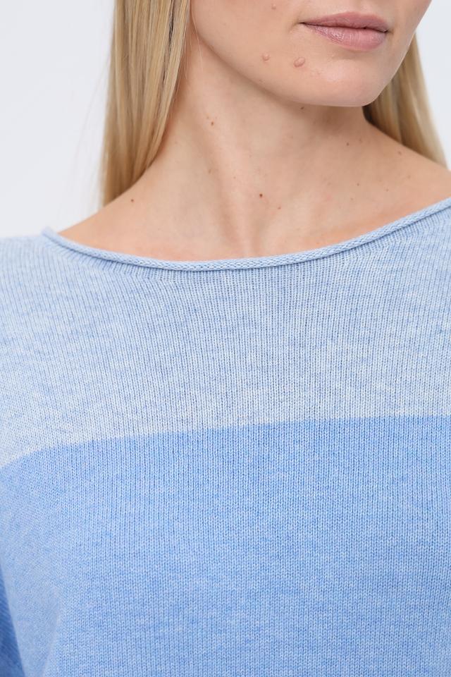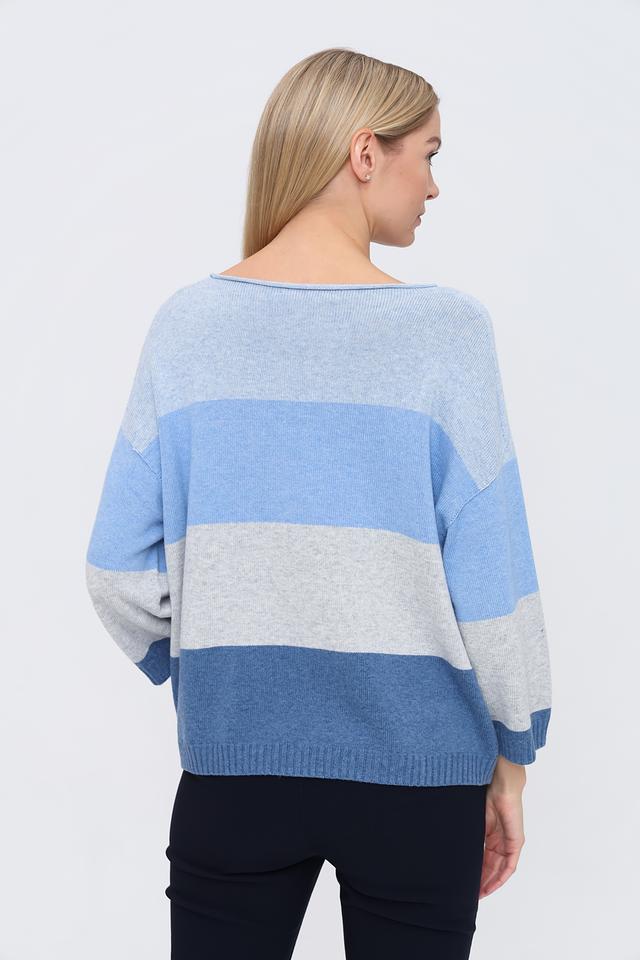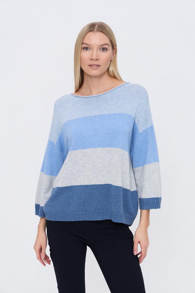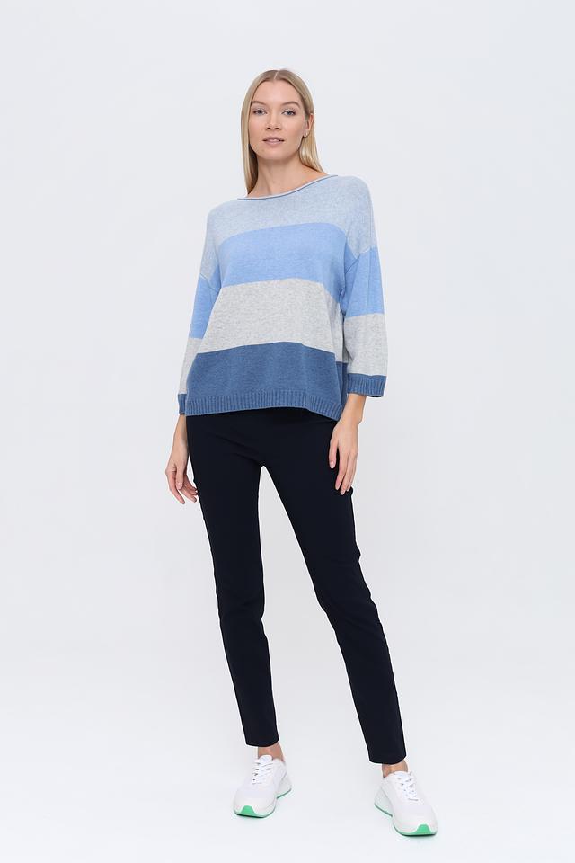 Пуловер имеет свободный крой и округлый вырез горловины, что делает его универсальным для различных образов. Горизонтальные полосы в голубых и серых тонах придают изделию современный и свежий вид.