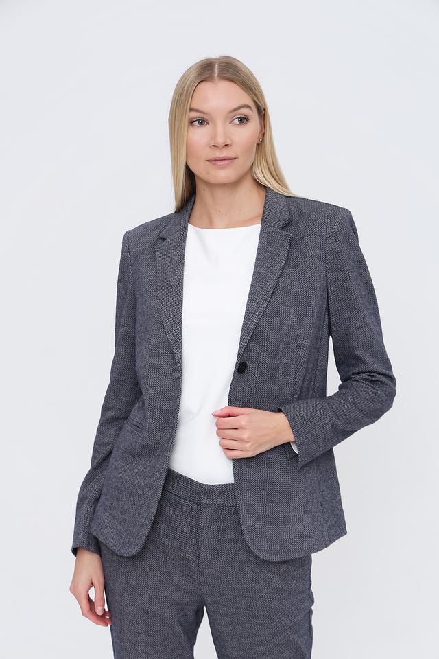 Состав ткани: 66% полиэстер, 31% вискоза, 3% эластан. Это сочетание материалов обеспечивает жакету приятные тактильные ощущения, хорошую посадку по фигуре и устойчивость к сминанию.