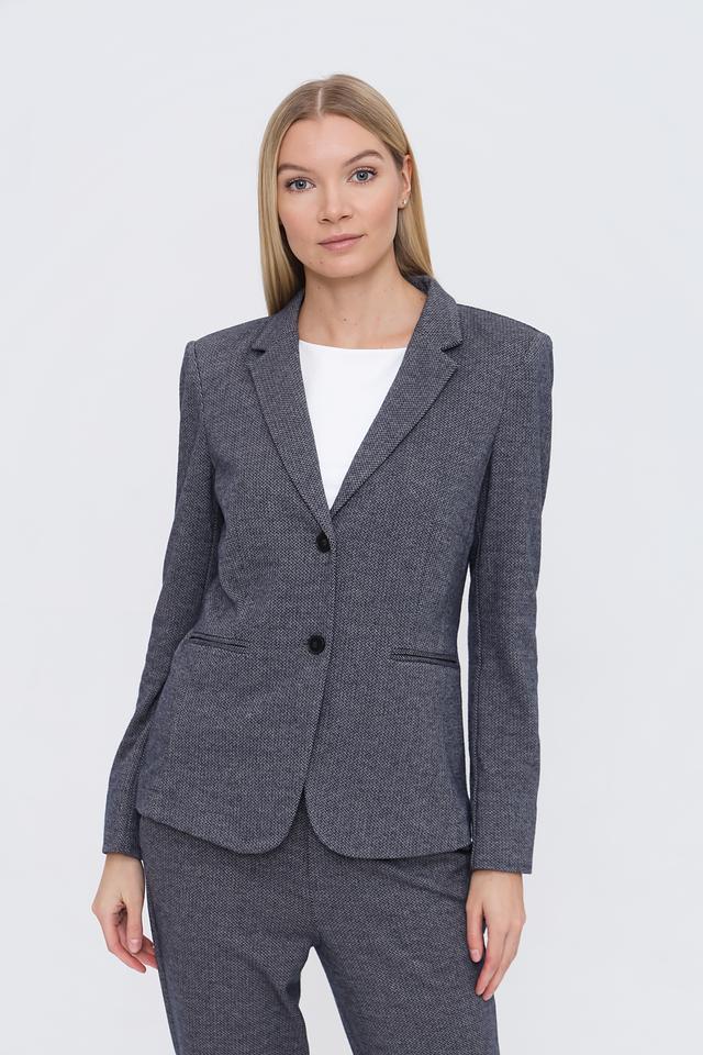 Жакет имеет застежку на три пуговицы в тон ткани, что обеспечивает удобство и надежность. Длинные рукава и лацканы стандартной ширины придают жакету элегантный вид. Подкладка обеспечивает комфорт при носке.