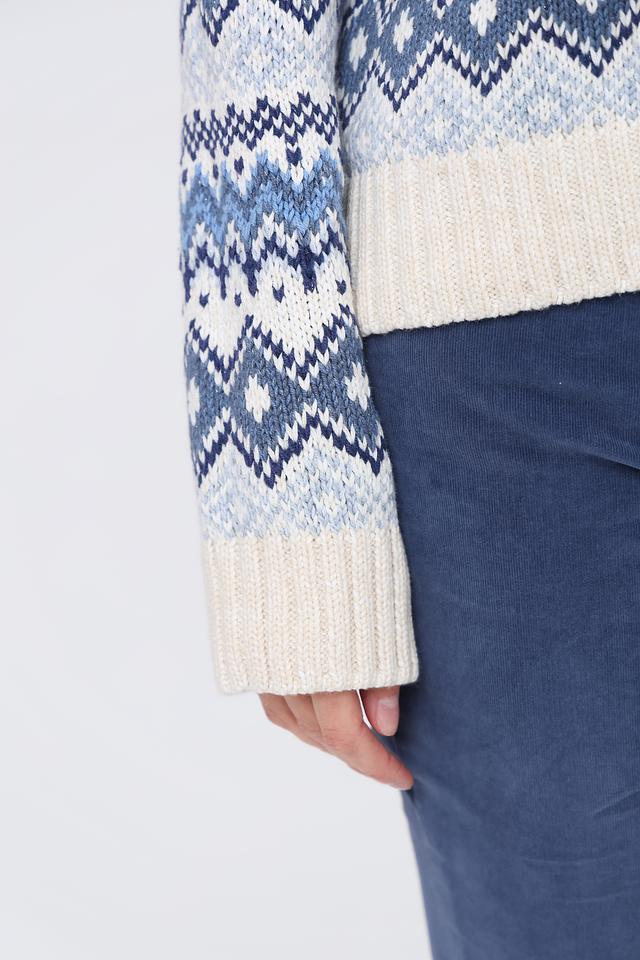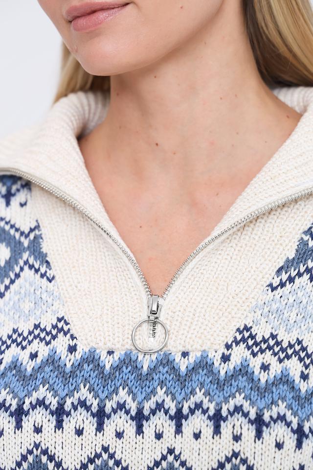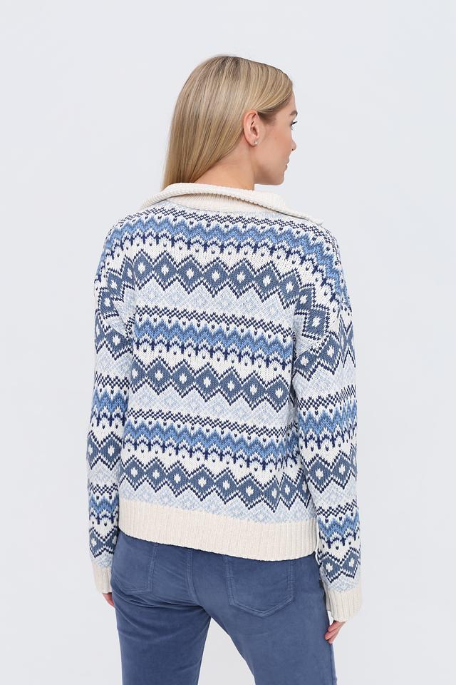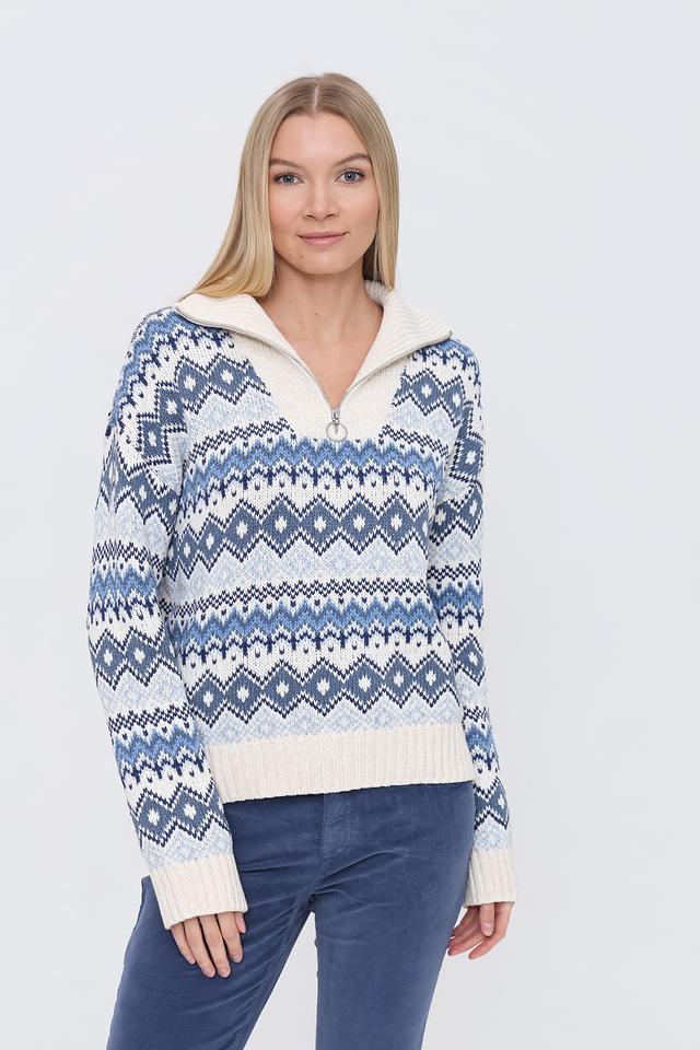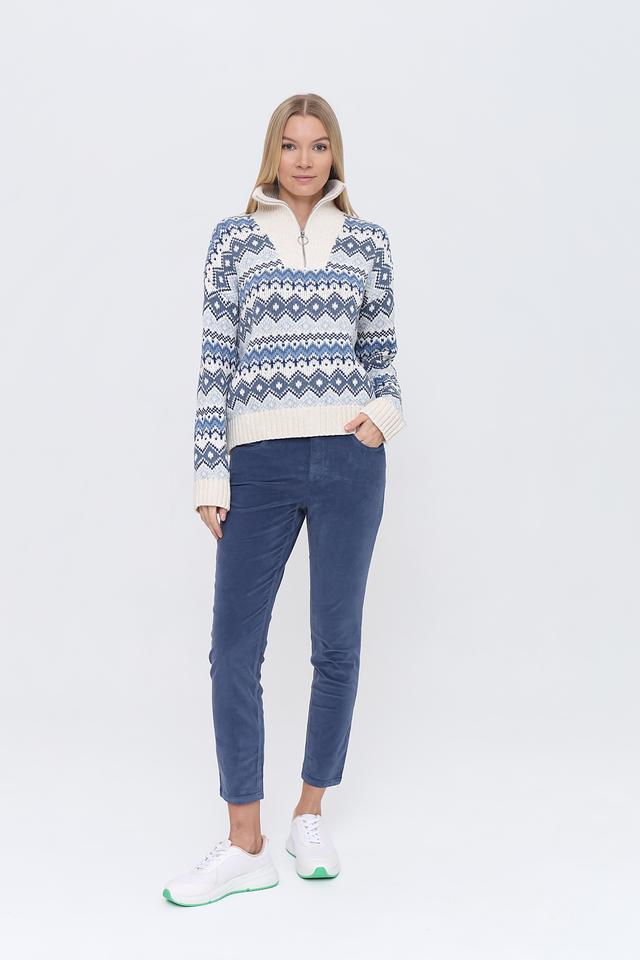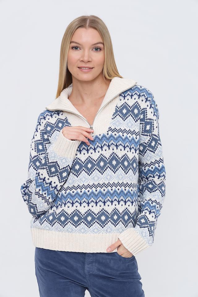 Пуловер имеет кремовый цвет, украшенный выразительным голубым узором, напоминающим зимние мотивы. Короткая молния на горловине позволяет регулировать степень открытости и создавать различные образы.