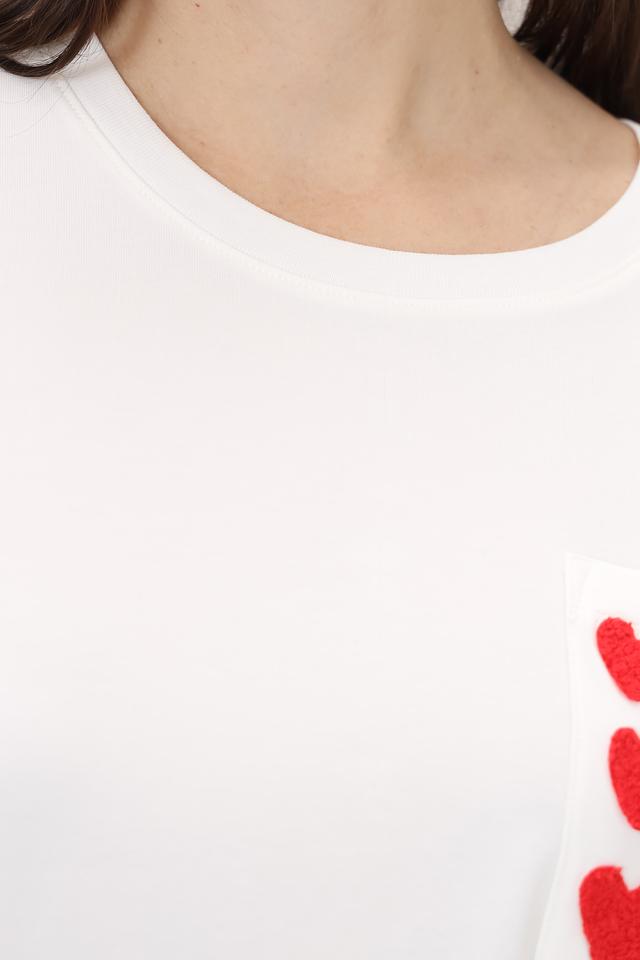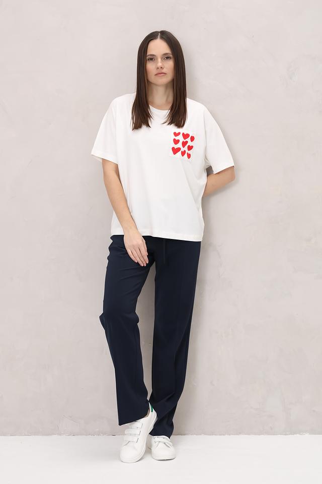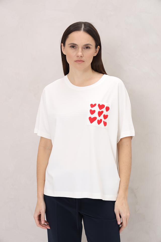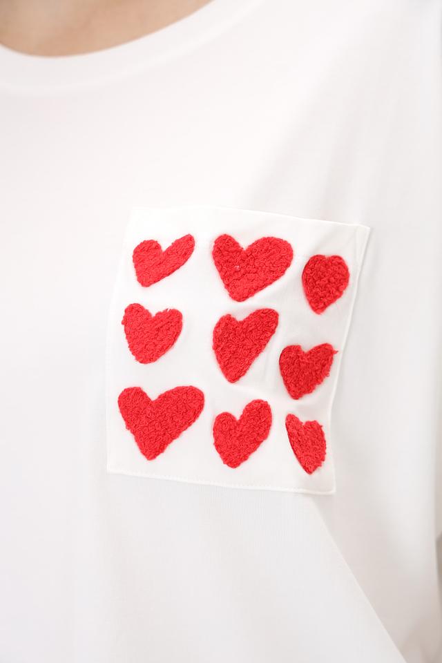Особенностью данной модели является яркий принт в виде красных сердечек, расположенных на нагрудном кармане. Этот акцент придает футболке игривый и романтичный вид.